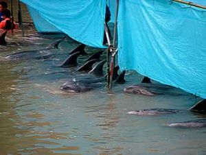 Especially in Japan, where large pods of dolphins migrate along the coast, dolphin hunting is common sight. Around the end of september the drive hunt starts, killing 23.000 dolphins during a horrific slaughter.